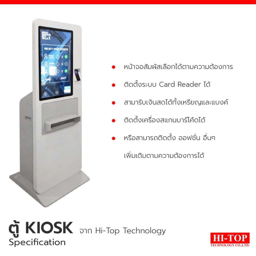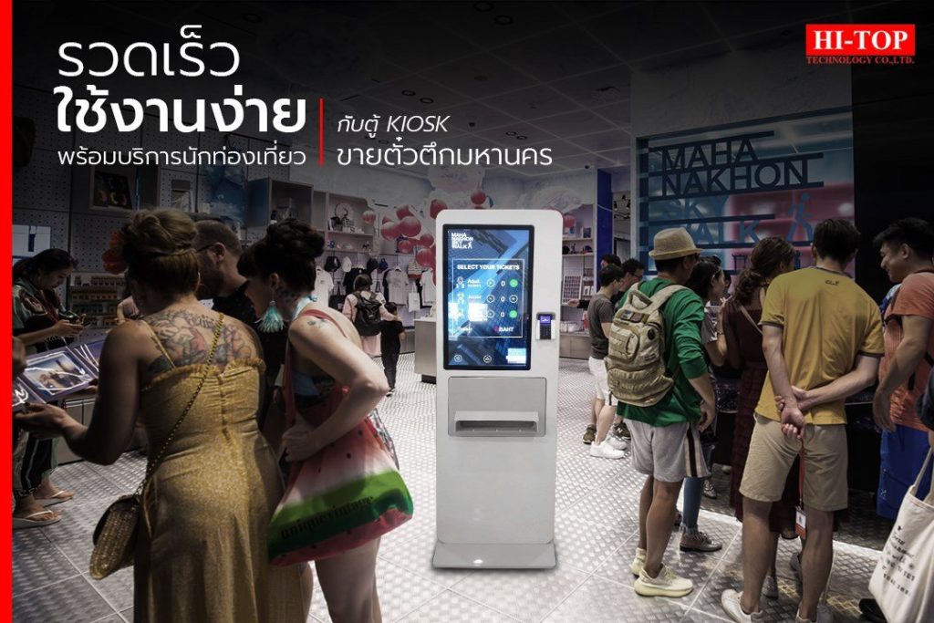 ตึกมหานครเลือกใช้ตู้ KIOSK ขายตั๋ว จาก Hi-Top ให้บริการด้านการขายตั๋วที่รวดเร็ว แม่นยำ และยังช่วยประหยัดแรงงานคน สามารถรองรับการจ่ายเงินได้หลากหลายรูปแบบ ทั้ง WeChat Alipay Visa Mastercard ที่ Hi-Top ยังสามารถ Customize ทั้ง Hardware และ Software ได้ตามความต้องการของคุณ