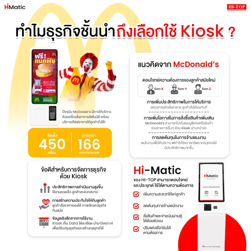 เมื่อพูดถึงธุรกิจอาหารระดับโลกอย่าง McDonald’s หลายคนคงคุ้นเคยกับการบริการที่รวดเร็วและทันสมัย ล่าสุด McDonald’s ประเทศไทยได้ติดตั้ง Self-Ordering Kiosk มากกว่า 450 เครื่อง ในกว่า 166 สาขาทั่วประเทศ พร้อมยกระดับการให้บริการด้วยการ เสิร์ฟอาหารถึงโต๊ะ เพื่อมอบประสบการณ์ที่เหนือกว่าให้กับลูกค้า ทำไม McDonald’s ถึงเลือกใช้ Kiosk? การลงทุนใน Kiosk ของ McDonald’s ไม่ได้เป็นเพียงเรื่องของเทคโนโลยี แต่เป็นกลยุทธ์ที่ตอบโจทย์ธุรกิจและพฤติกรรมผู้บริโภคยุคใหม่ ประโยชน์ของ Kiosk ต่อการจัดการธุรกิจ นอกเหนือจากประสบการณ์ลูกค้าแล้ว การติดตั้ง Kiosk ยังช่วยยกระดับการบริหารจัดการธุรกิจในหลายด้าน ได้แก่ HI-MATIC: ผู้ช่วยใหม่ของธุรกิจยุคดิจิทัล สำหรับผู้ประกอบการที่ต้องการยกระดับประสบการณ์ลูกค้าและเพิ่มประสิทธิภาพการจัดการ Hi-Top Technology ขอแนะนำ HI-MATIC ตู้ออเดอร์อัตโนมัติ ที่สามารถปรับใช้งานได้หลากหลายตามความต้องการ HI-MATIC คือตัวช่วยใหม่สำหรับธุรกิจยุคดิจิทัล ที่จะทำให้ลูกค้าสามารถสั่งสินค้าและชำระเงินเองได้ง่าย ๆ ไม่ต้องรอคิว พร้อมเพิ่มความแม่นยำ และความประทับใจในทุกการบริการ