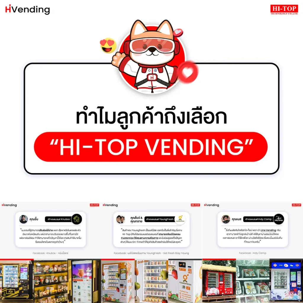 Hi-Top Technology พาคุณไปฟังเสียงจริงจากเจ้าของธุรกิจ 3 แบรนด์ ที่เลือกใช้ตู้จำหน่ายสินค้าอัตโนมัติของเรา ว่าอะไรที่ทำให้พวกเขา ไว้วางใจและมั่นใจใน Hi-Top Vending Knubox – คนับบ็อกซ์ คุณอั๋น – เจ้าของแบรนด์ Knubox “ผมชอบที่ตู้สามารถ ปรับช่องได้ง่าย เพราะสินค้าของผมมีขนาดไม่เท่ากัน แต่ละกล่องสามารถปรับช่องขายให้เหมาะกับสินค้าได้เอง ทำให้แก้ไขปัญหานี้ได้ดีและช่วยเพิ่มยอดขายได้มากขึ้น ตอบโจทย์ธุรกิจใหม่ ๆ ได้อย่างชัดเจน” YoungFresh – Eat Fresh Stay Young คุณโบว์ & คุณทราย – เจ้าของแบรนด์ YoungFresh “สินค้าของ YoungFresh เป็นผลไม้สด เวลาจึงเป็นสิ่งสำคัญ Hi-Top มีทีมพัฒนาโปรแกรมเองที่สามารถ Customize Software ให้ตรงกับความต้องการ ของเราได้ และยังช่วยดูแลแก้ไขปัญหาได้ทันเวลา (On-Time) ทำให้ธุรกิจสินค้าสดดำเนินไปได้ไม่สะดุดเลยค่ะ” Indy Camp คุณเนส – เจ้าของแบรนด์ […]