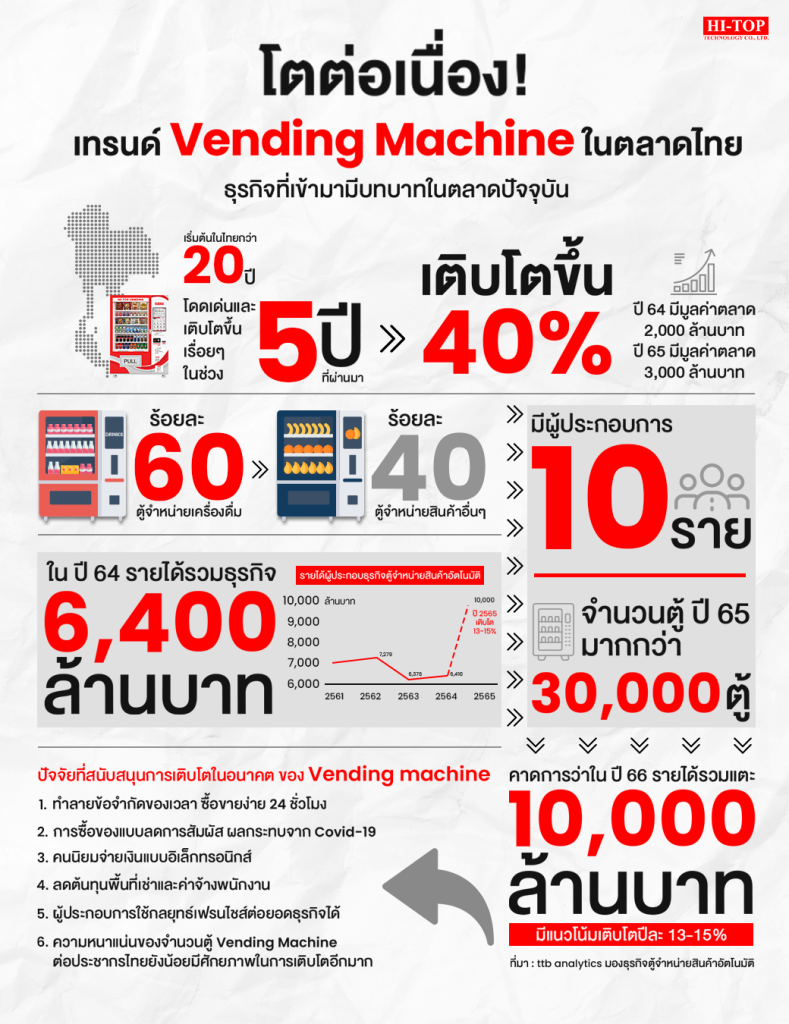 HI-TOP จึงได้รวบรวมข้อมูล และภาพรวมของ Vending Machine ที่กำลังเป็นที่จับตามองในตลาดปัจจุบัน เพื่อเป็นข้อมูลและความรู้ที่จะเป็นประโยชน์สำหรับธุรกิจของคุณ ปัจจัยที่สนับสนุนการเติบโตในอนาคตของ Vending Machine ขอบคุณข้อมูลจาก ศูนย์วิเคราะห์เศรษฐกิจ ttb analytics
