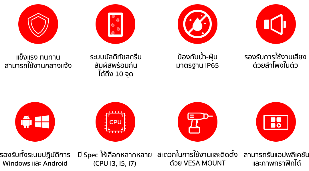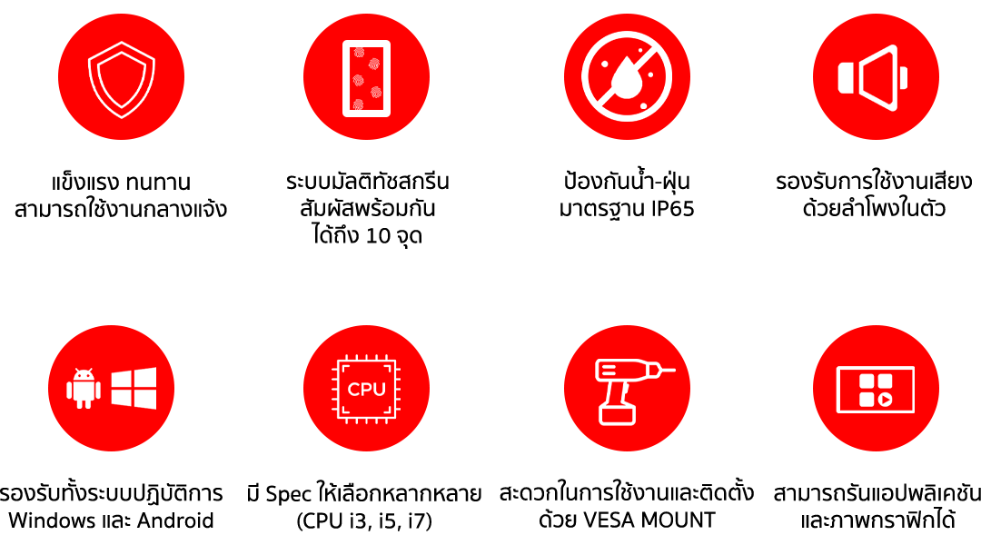 จอทัชสกรีนจาก Hi-Top มีรุ่นให้เลือกหลากหลาย ไม่ว่าจะเป็นจอแบบแท็บเล็ต ซึ่งเหมาะกับนักเรียน โรงเรียนหรือสถานศึกษา จอแบบตั้งโต๊ะเพื่อการประชุมงาน จอทัชสกรีนแบบตั้งพื้นที่เหมาะกับงานขายหรือติดตั้งตามศูนย์การค้า จนไปถึงจอแบบติดผนังเพื่องานนิทรรศการหรือแสดงต่าง ๆ ทั้งยังมีให้เลือกหลากหลายขนาดตั้งแต่ 7 นิ้วจนถึง 100 นิ้ว เพื่อให้ตอบโจทย์การใช้งานในทุกรูปแบบ ทุกสถานที่ จบครบทั้งระบบตั้งแต่การออกแบบ ระบบซอฟต์แวร์ และบริการหลังการขายที่ครบวงจร